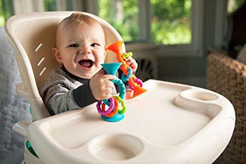 The sensory toys for babies feature vivid textures, clacking rings; and stick to any smooth surface