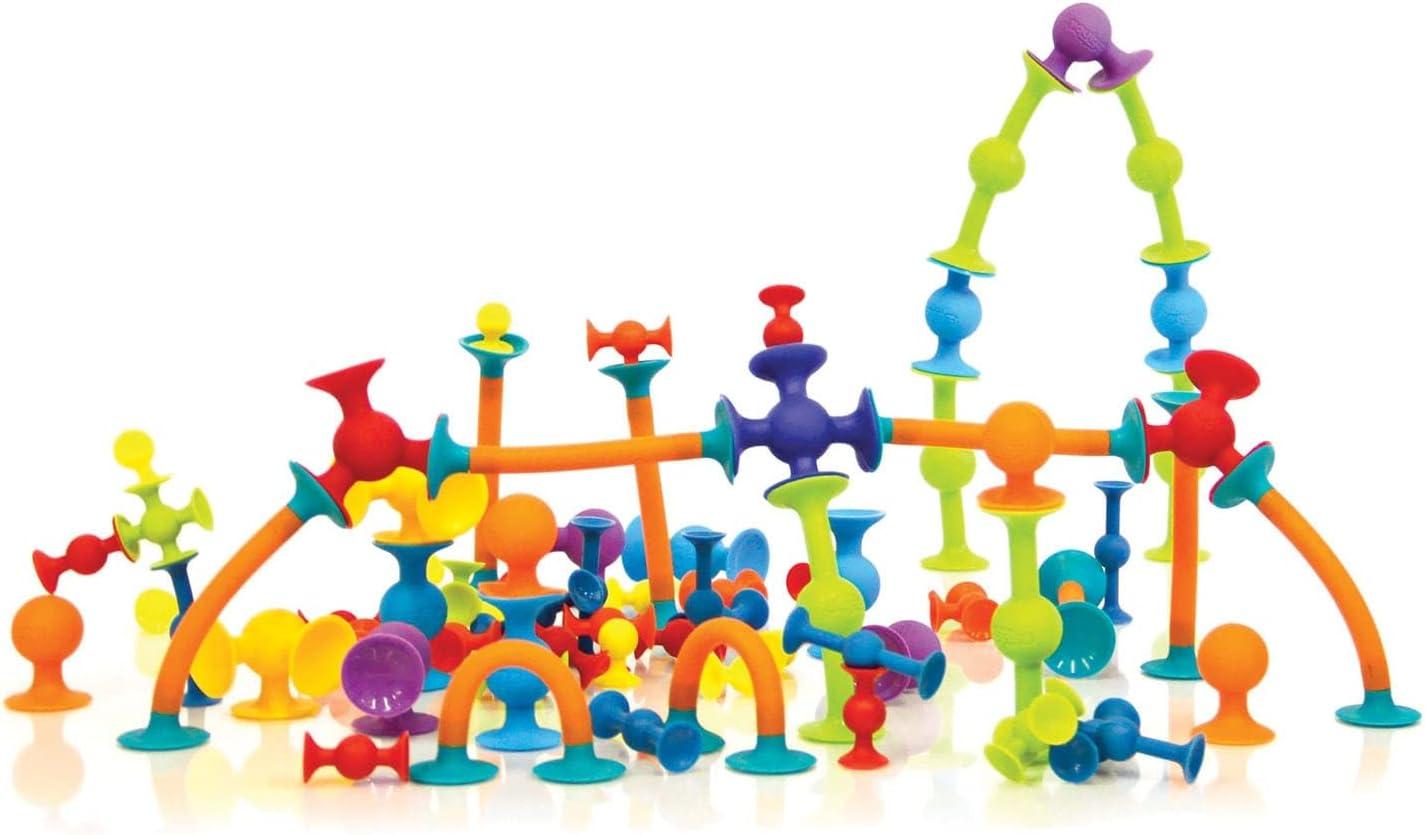 FUN LITTLE SUCKERS! – Our exclusive Squigz construction toy set features 75 innovative suction fidget toy pieces that stick to each other and most flat surfaces, then pull apart with a POP.